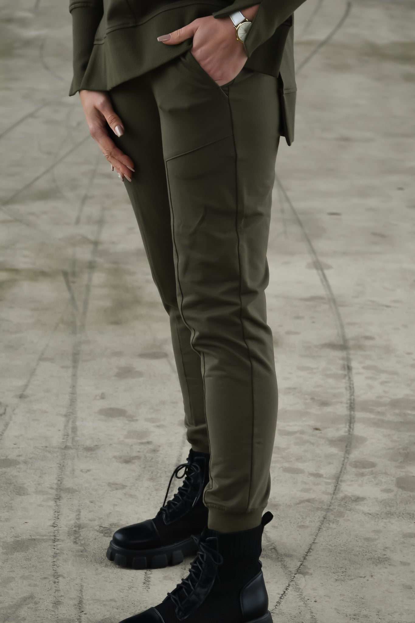 Chaki spalvos, elastingo trikotažo kelnės. Su kišenėmis, juosmuo su guma ir raišteliu.