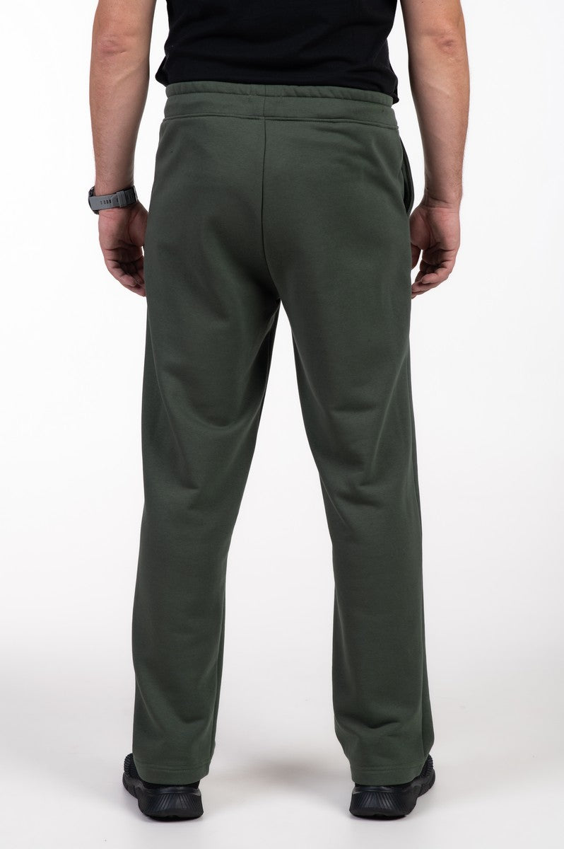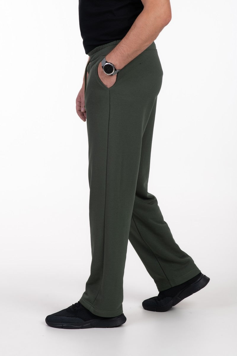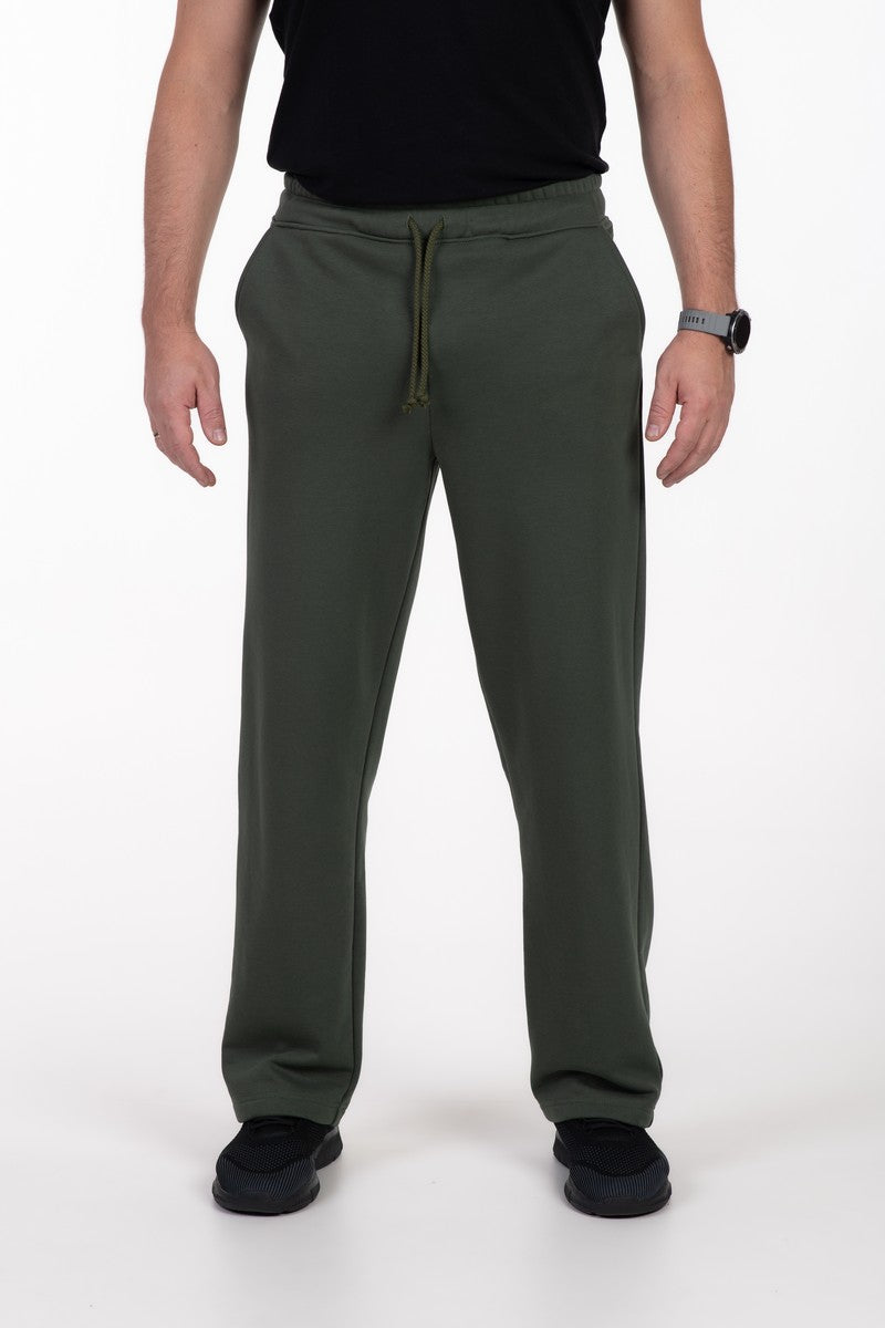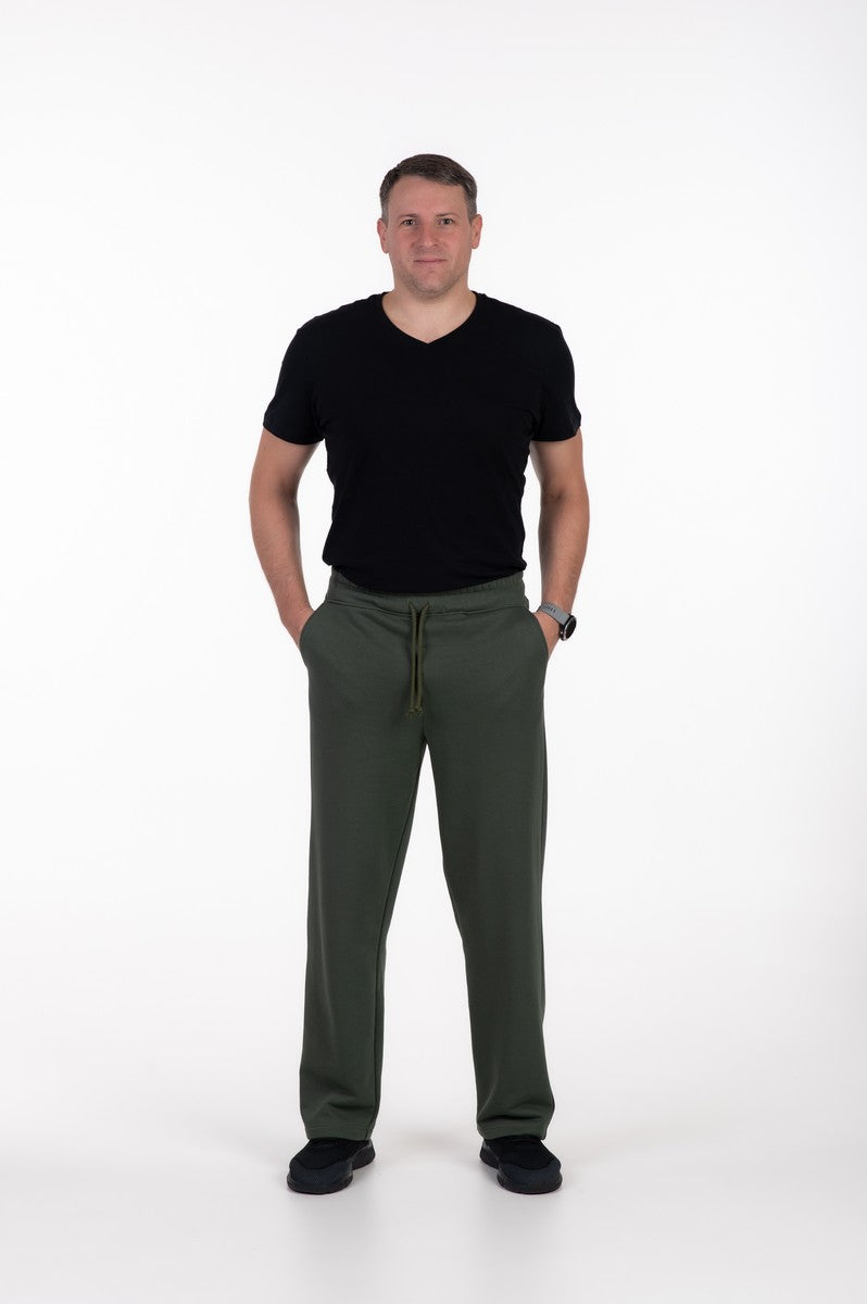 Kelnės chaki spalvos, tiesaus kirpimo, su kišenėmis. Juosmuo su guma ir raišteliu.