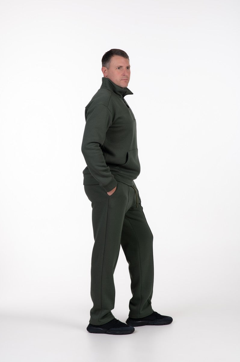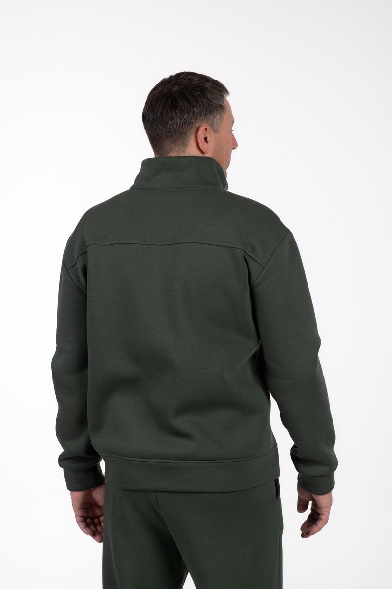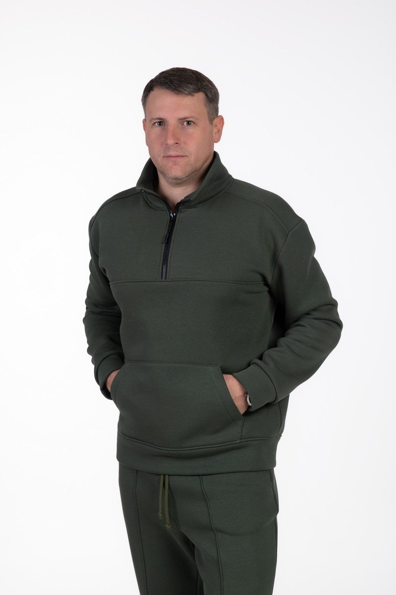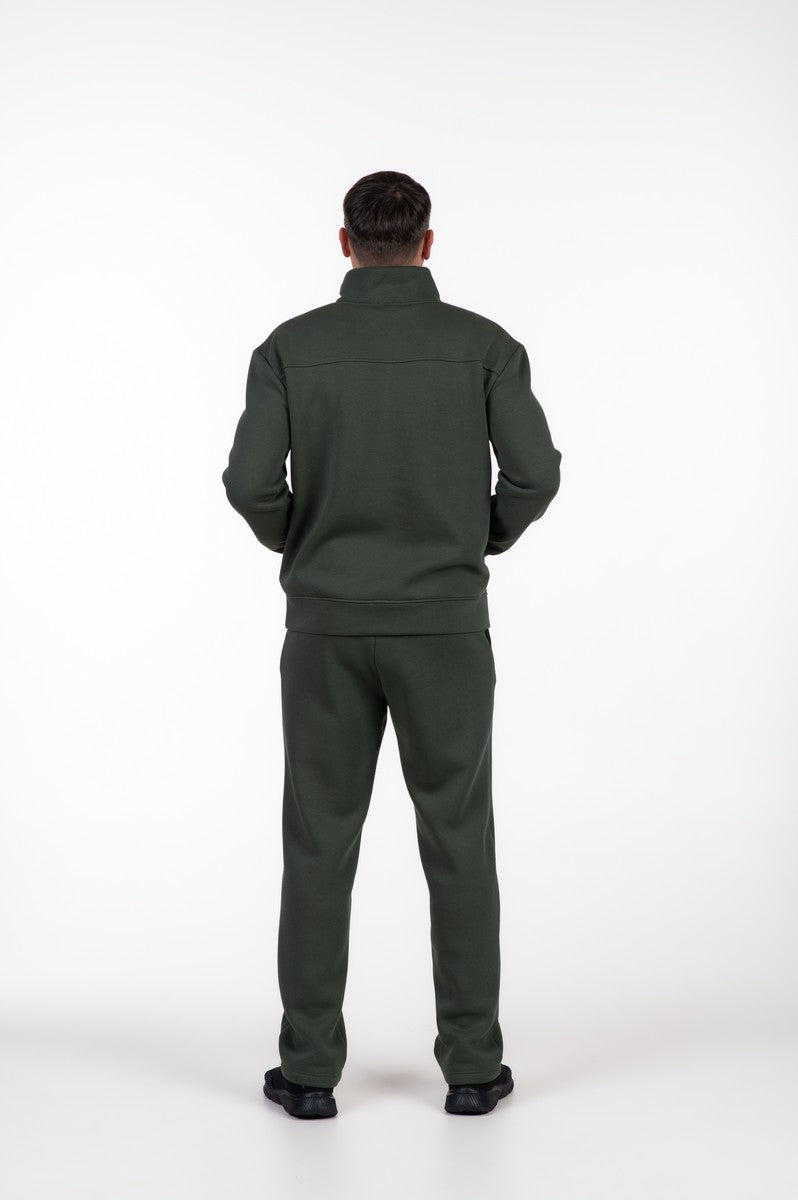 Vyriškas laisvalaikio kostiumas iš švelnaus trikotažo su pūkeliu vidinėje pusėje. Chaki spalvos komplektas - šiltas, patogus ir universalus pasirinkimas kasdieniam dėvėjimui.