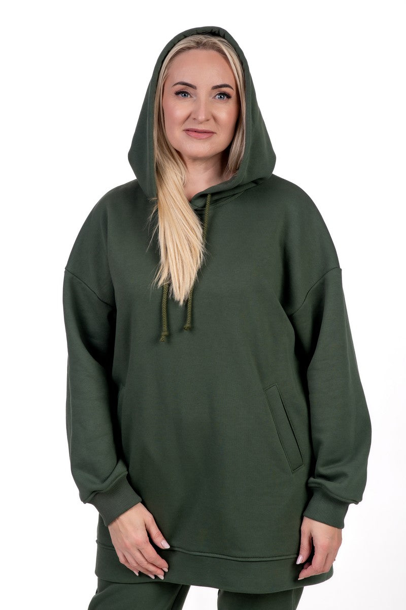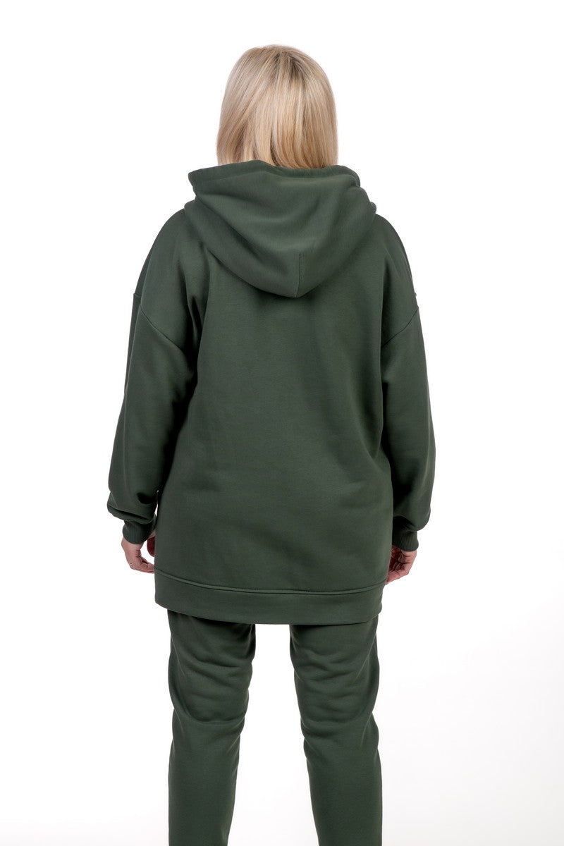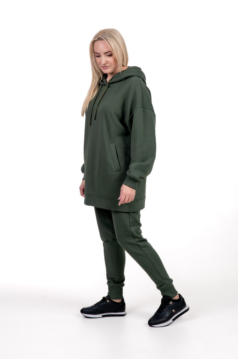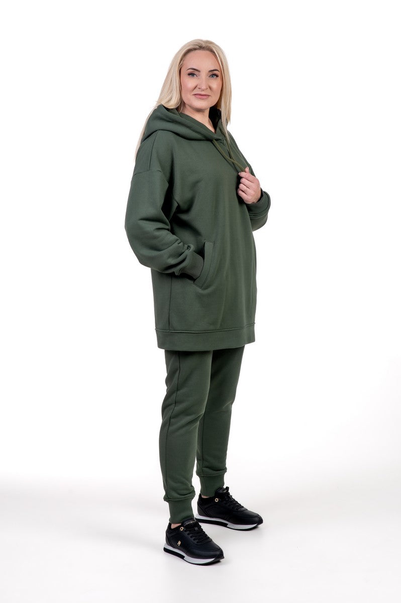 Chaki spalvos kostiumėlis – modernus ir praktiškas pasirinkimas. Žemiškas tonas suteikia išskirtinumo, o lengvai krintantis audinys ir siaurintos kelnės užtikrina komfortą judant. Ilgas džemperis su gobtuvu ir kišenėmis puikiai tinka tiek pasivaikščiojimams, tiek ramesnėms dienoms namuose.