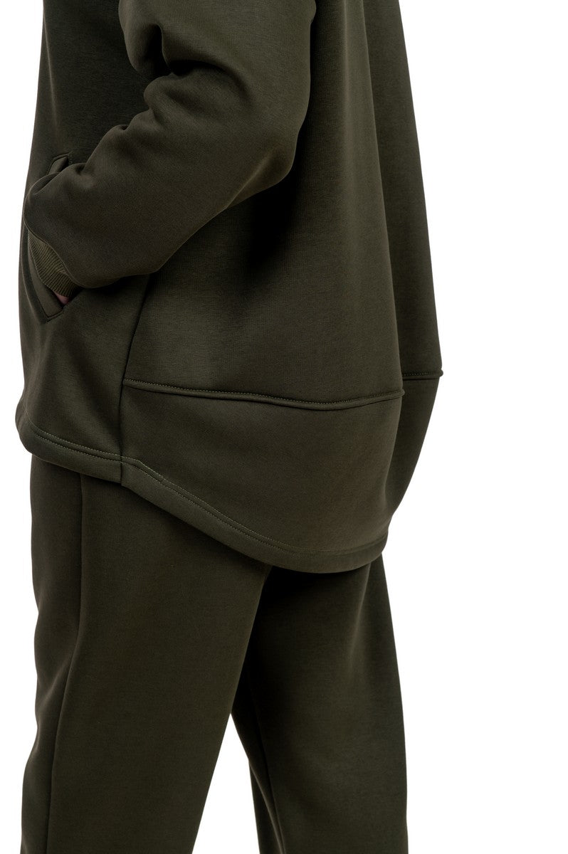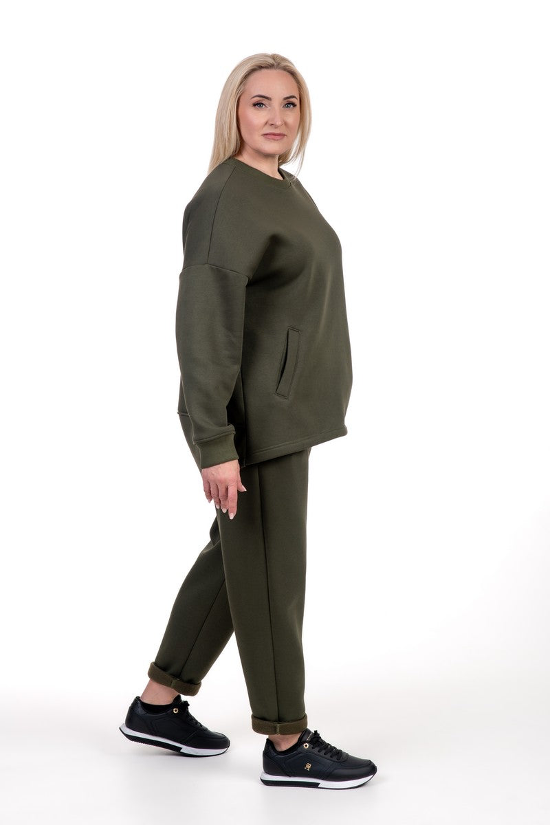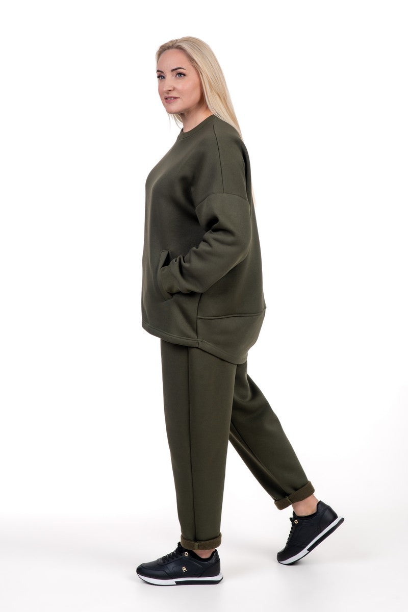 Chaki moteriškas kostiumėlis išsiskiria moderniu, žemišku atspalviu ir ypatingu jaukumu. Audinys su pūkeliu vidinėje pusėje suteikia šilumos pojūtį, todėl kostiumėlis puikiai tinka rudeniui, žiemai ir pavasariui. Tai stilingas, bet praktiškas pasirinkimas moterims, mėgstančioms natūralius tonus ir patogumą.
