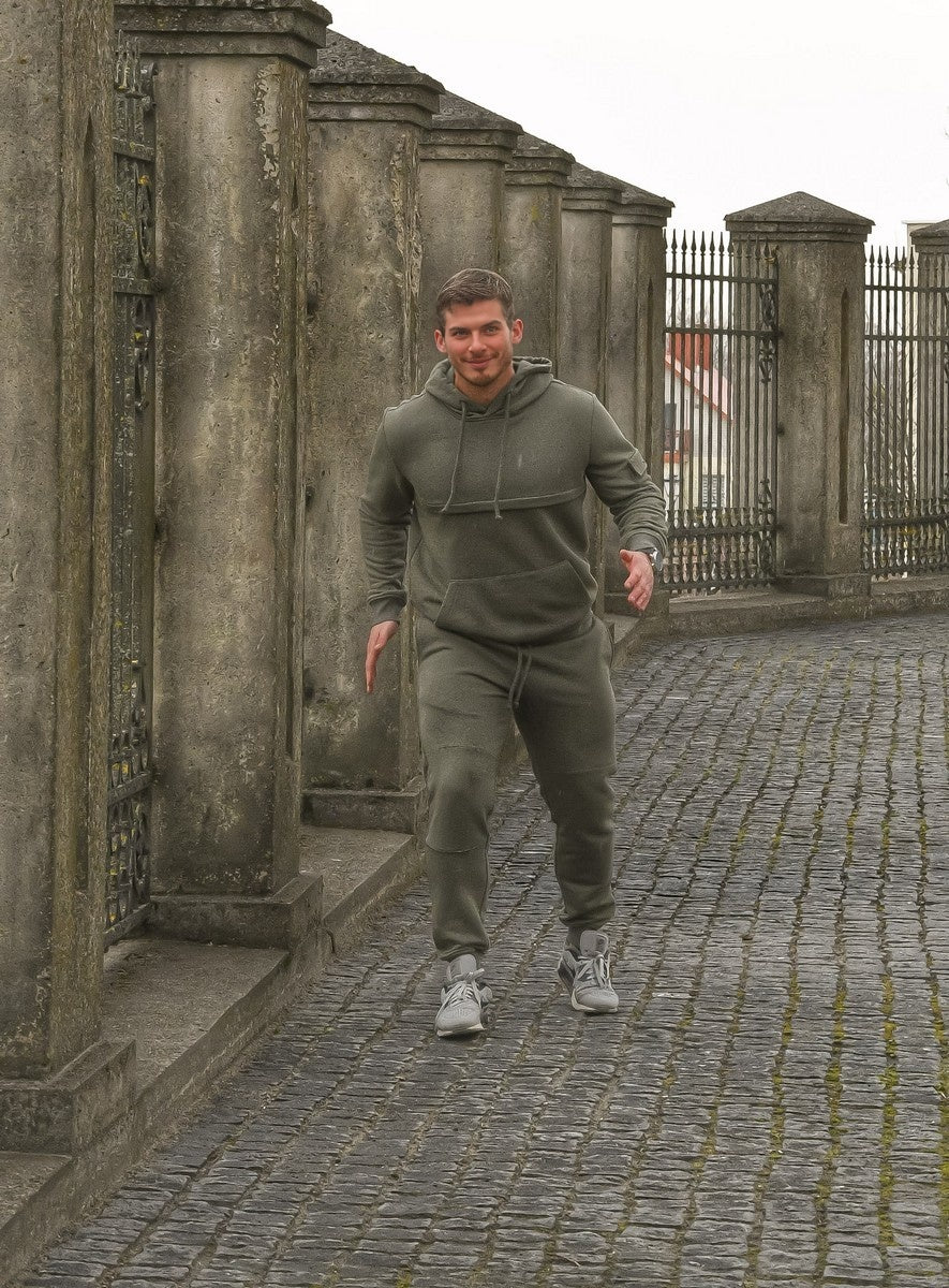 Sportinis džemperis tampraus audinio, išskirtinio dizaino, chaki spalvos . Džemperis su kišenėmis, kurių viena ant rankovės. Su gobtuvu.