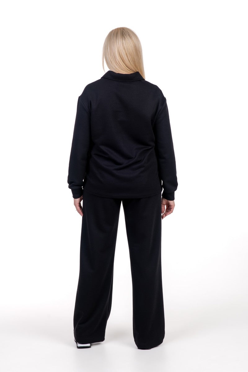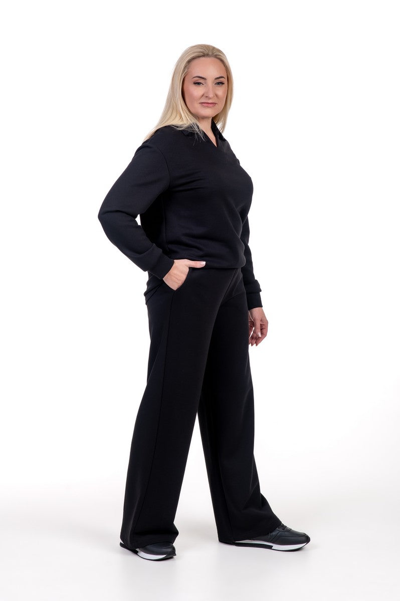 Juodas laisvalaikio kostiumėlis – tai universalaus stiliaus klasika. Lengvas ir laisvai krintantis audinys suteikia komforto, o juoda spalva užtikrina lengvą derinimą su bet kokiais batais ar aksesuarais. Puikus pasirinkimas ieškančioms praktiško ir stilingo drabužio kasdienai.