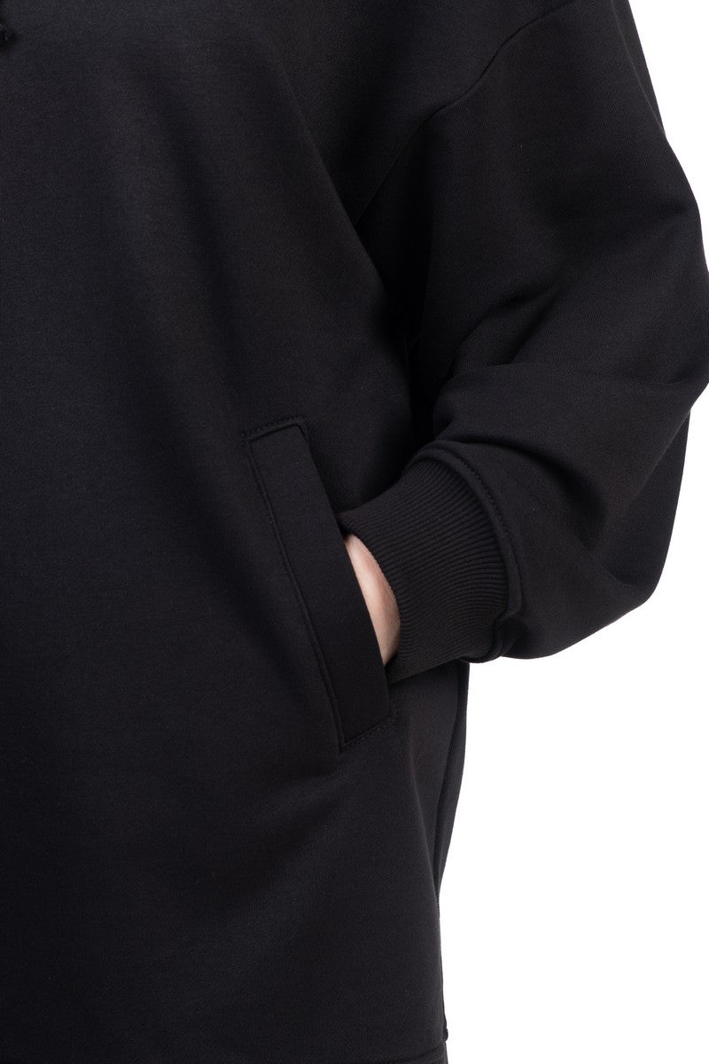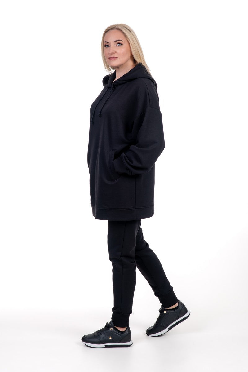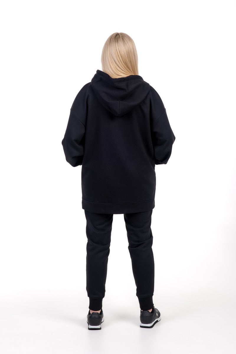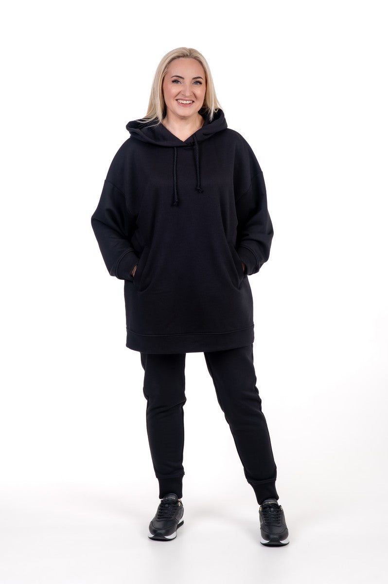 Juodas moteriškas laisvalaikio kostiumėlis – tikra klasika. Siaurintos kelnės su kišenėmis suteikia elegantišką, ilgą siluetą, o ilgas džemperis su gobtuvu kuria sportiškai stilingą įvaizdį. Juoda spalva lengvai derinama, todėl šis komplektas puikus pasirinkimas kasdienai, kelionėms ar darbams mieste.