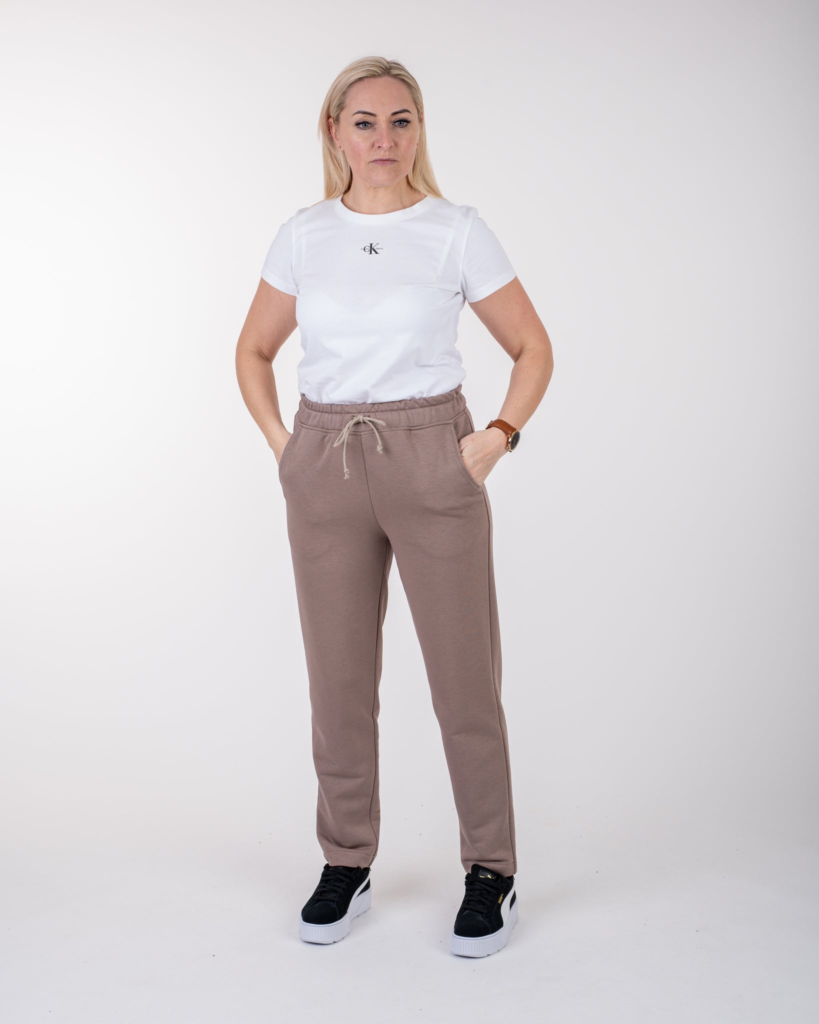 Laisvalaikio kelnės kreminės spalvos. Su kišenėmis, juosmuo su guma ir medvilnės raišteliu.