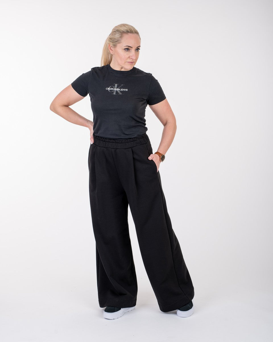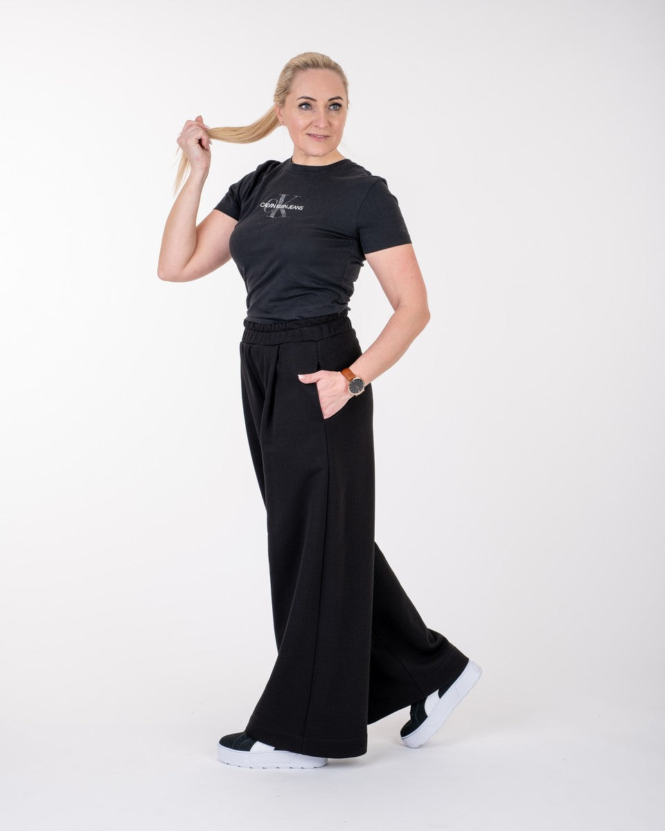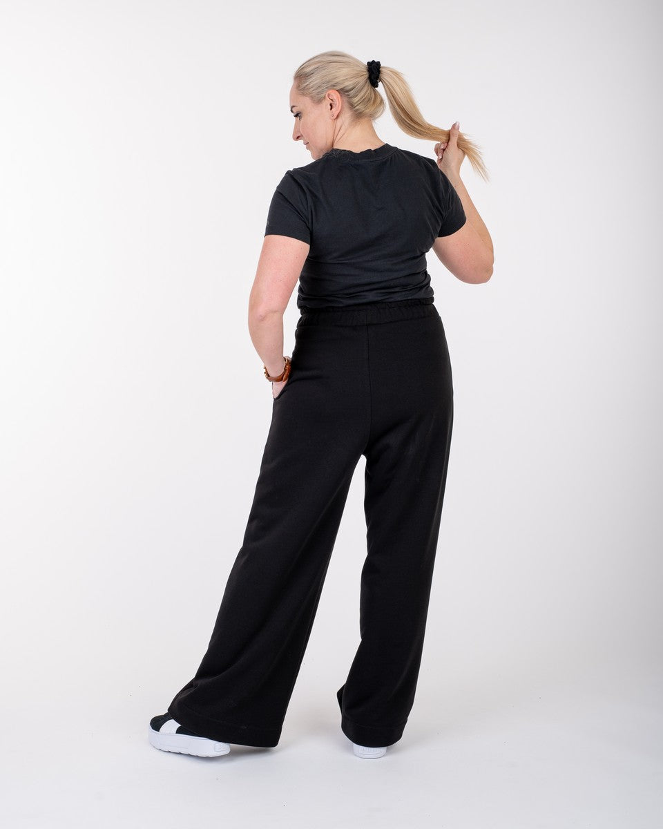 Kelnės juodos spalvos, plačios, priekyje su klostelėmis. Taip pat su giliomis, patogiomis kišenėmis. Juosmuo su plačia guma. Kelnių apačia lenkta iš pačio audinio.