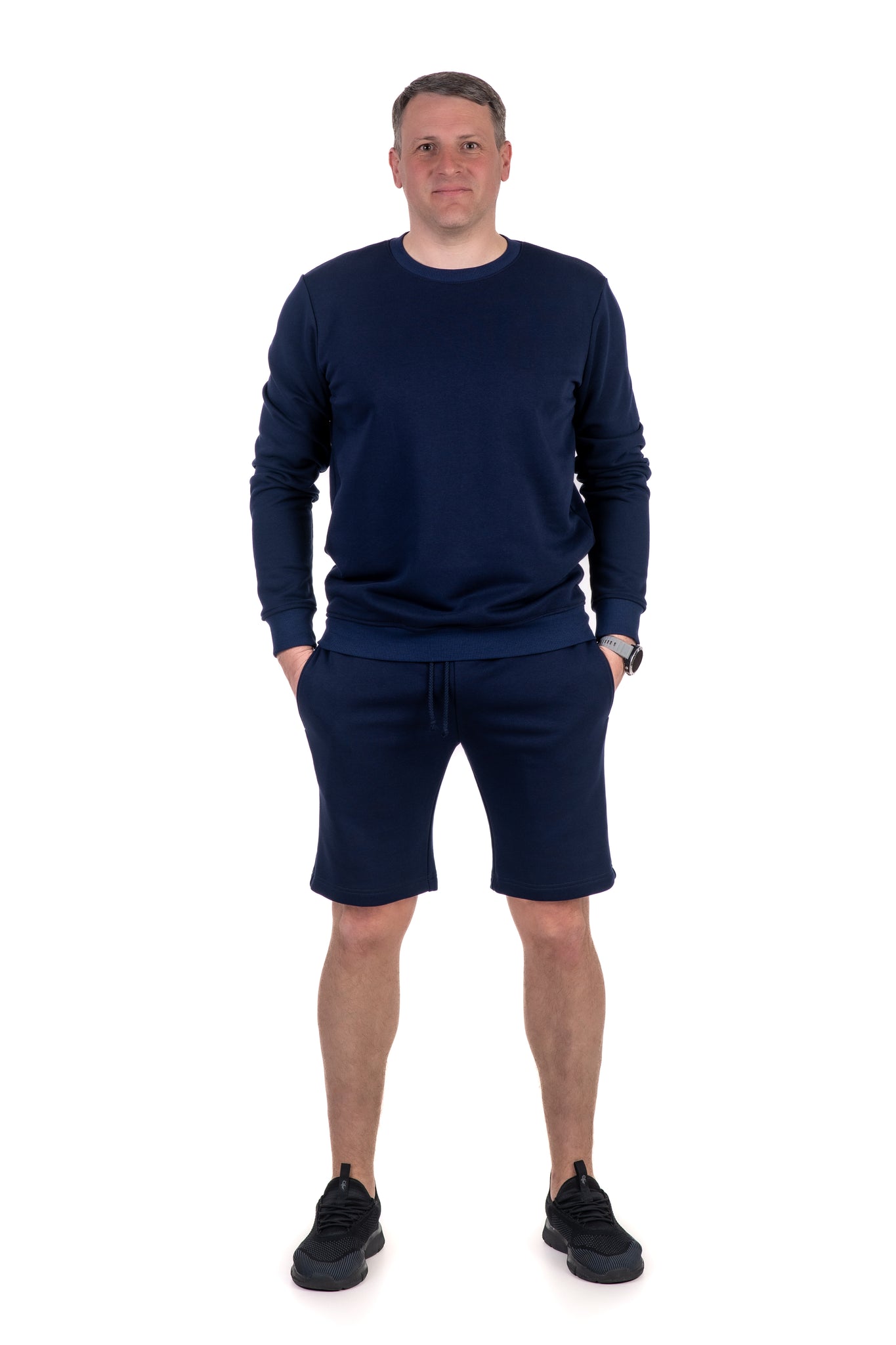 Šviesiai mėlynos spalvos trikotažinis kostiumas ir šortais. Šortai su giliomis kišenėmis, juosmuo su guma ir medvilnės virvele.