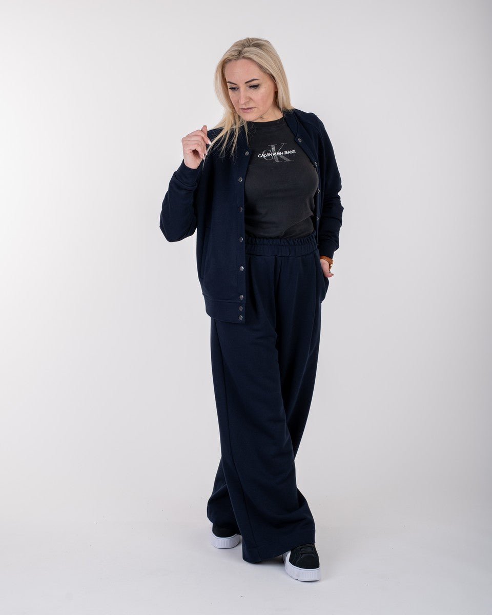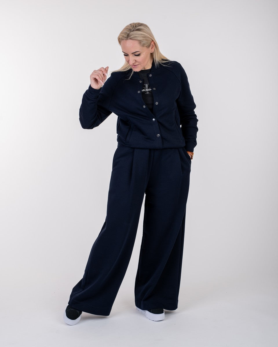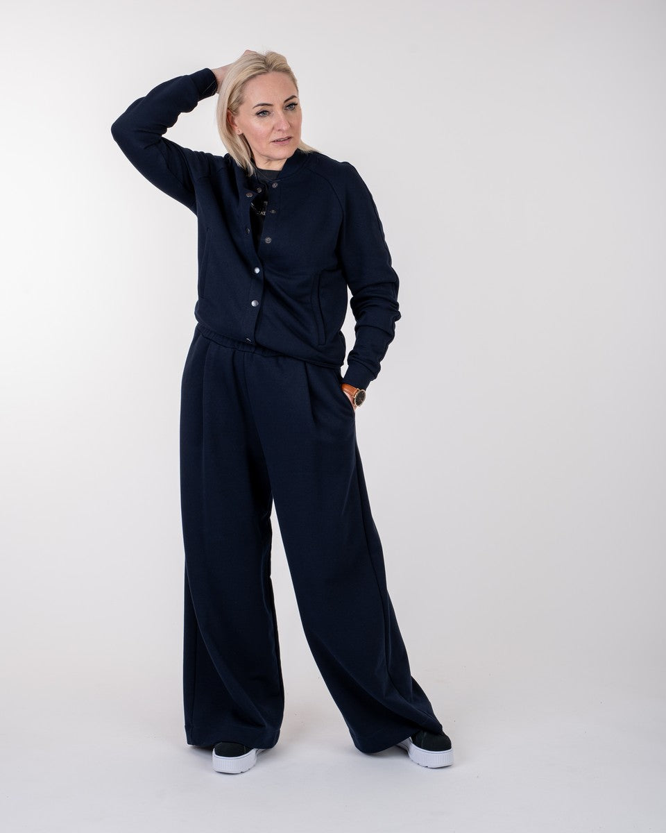 Kostiumėlis tamsiai mėlynos spalvos, kurį sudaro bomberis ir kelnės. Bomberis su kišenėmis, susegamas su spaudėmis. Kelnės plačios, priekyje su klostelėmis. Taip pat su giliomis, patogiomis kišenėmis. Juosmuo su plačia guma.