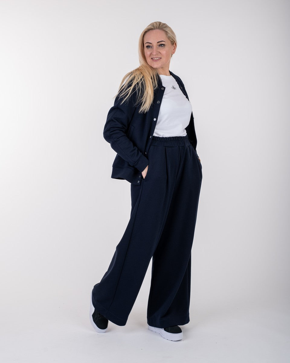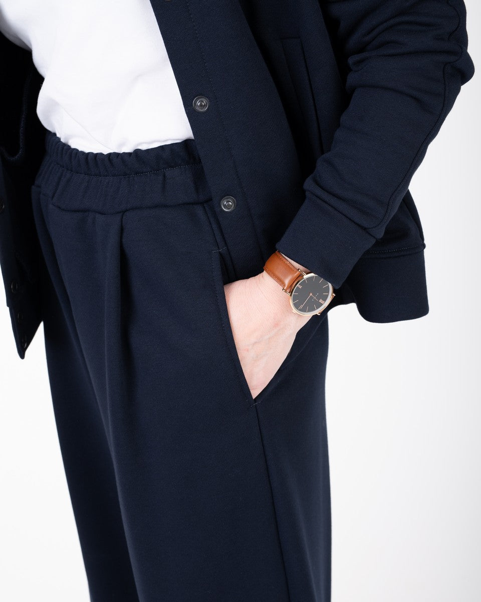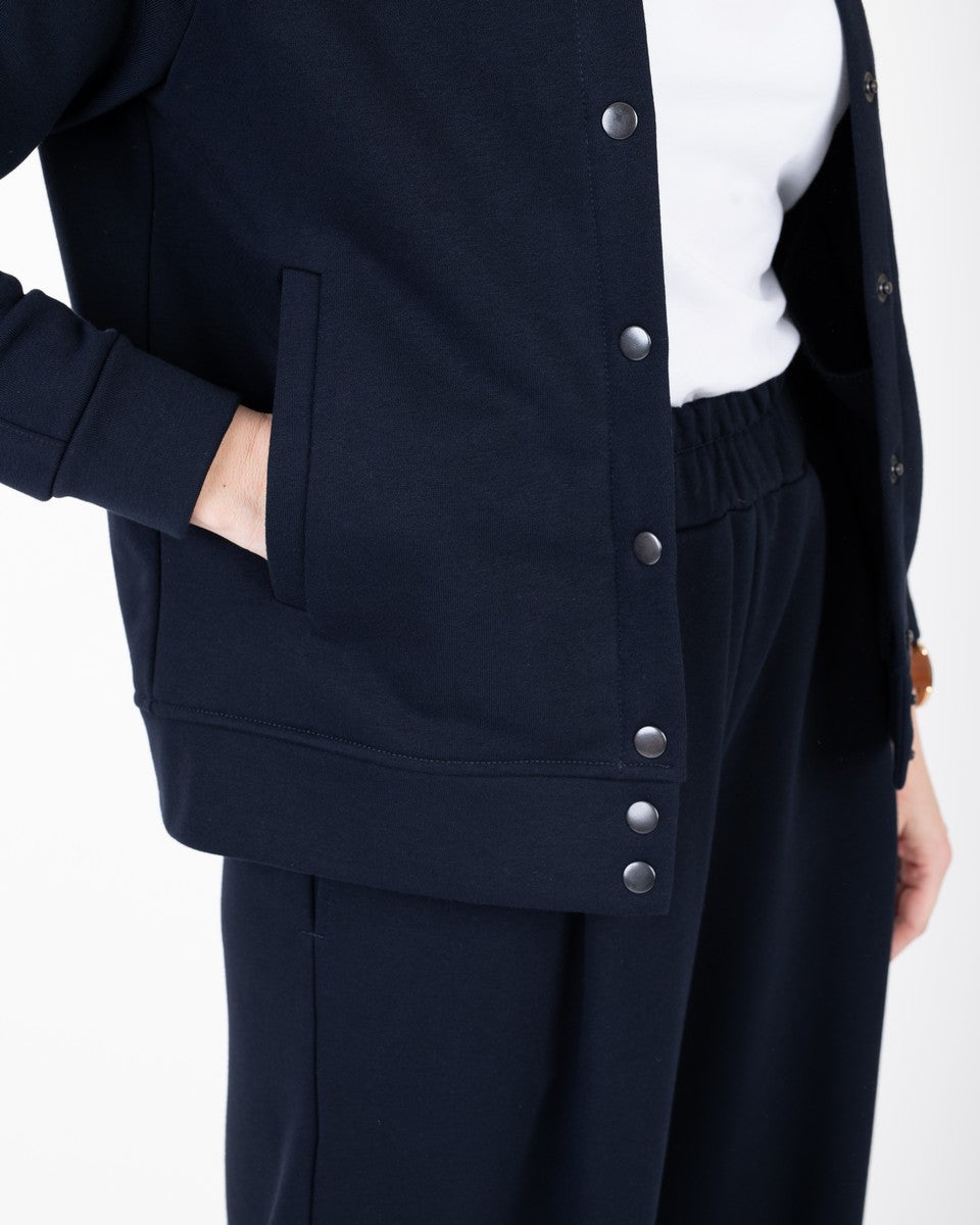 Kostiumėlis tamsiai mėlynos spalvos, kurį sudaro bomberis ir kelnės. Bomberis su kišenėmis, susegamas su spaudėmis. Kelnės plačios, priekyje su klostelėmis. Taip pat su giliomis, patogiomis kišenėmis. Juosmuo su plačia guma.