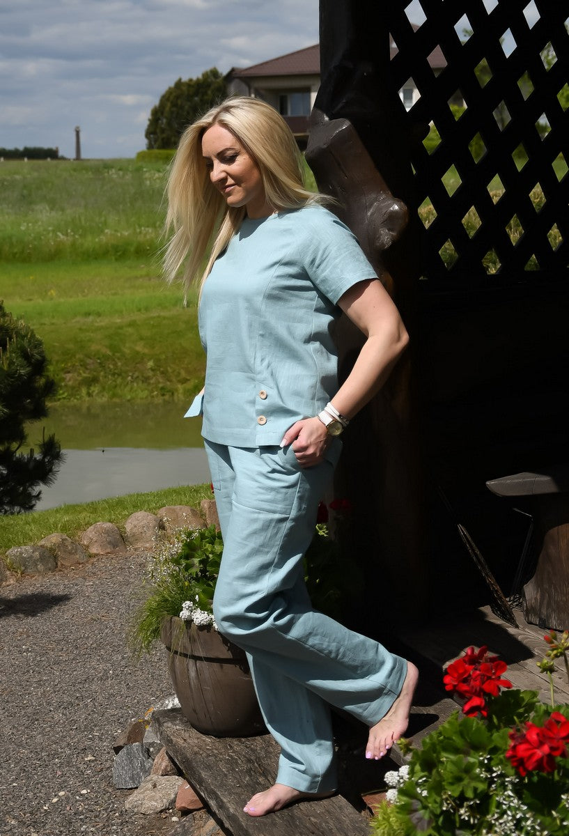 Lininio audinio, švelniai melsvos spalvos kostiumėlis. Palaidinės apačioje yra du skeltukai, kurie susegami su medinėmis sagutėmis. Kelnės su kišenėmis, juosmuo su guma.