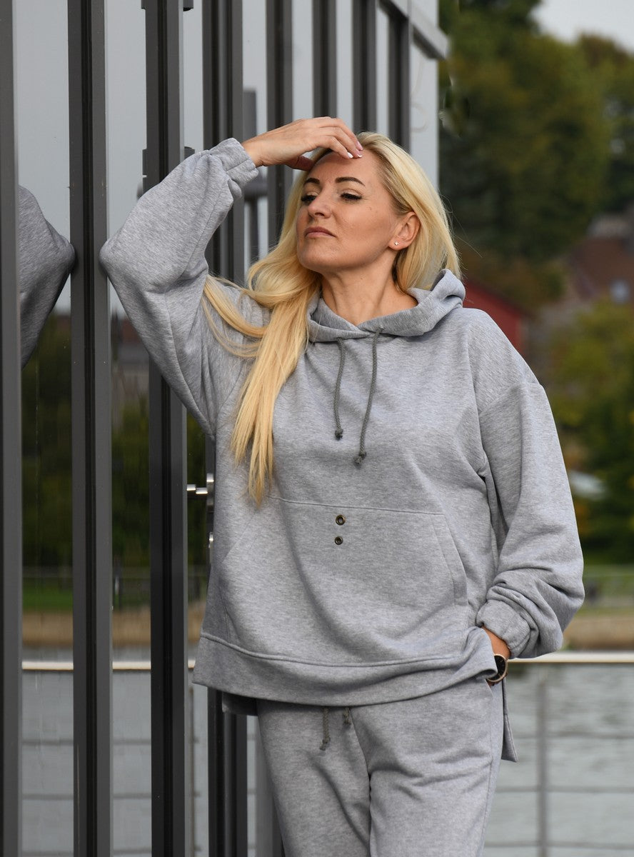 Laisvalaikio kostiumas šviesiai pilkos melanžo spalvos. Labai patogus, kokybiškas. Laisvalaikio kostiumėlis maloniai glaudžiasi prie kūno ir, tarsi, mus apkabina. Džemperis su gobtuvu ir kišenėmis. Šonai su skeltukais. Kelnės su giliomis kišenėmis, juosmuo su guma ir medvilnės virvele.