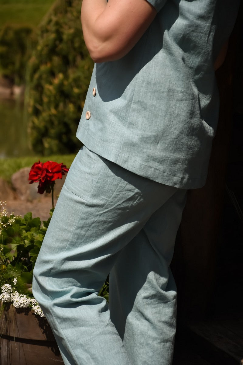 Melsvos spalvos lininio audinio palaidinė yra truputį platėjanti, su skeltukais, kurie susegti su sagutėmis. Nugarinė dalis prailginta.