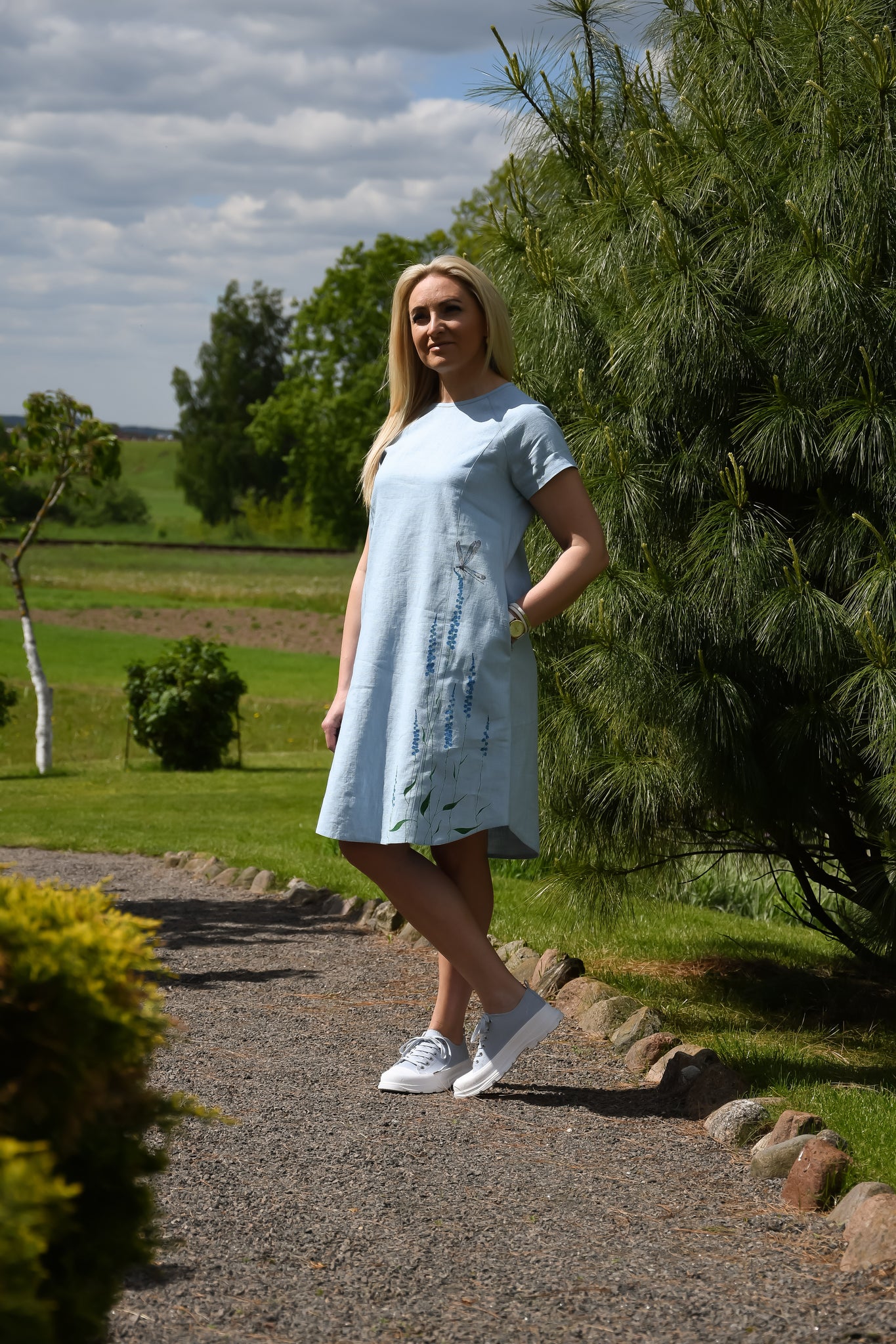 Melsvos spalvos lininė suknelė unikali, nes išpiešta dailininkės.