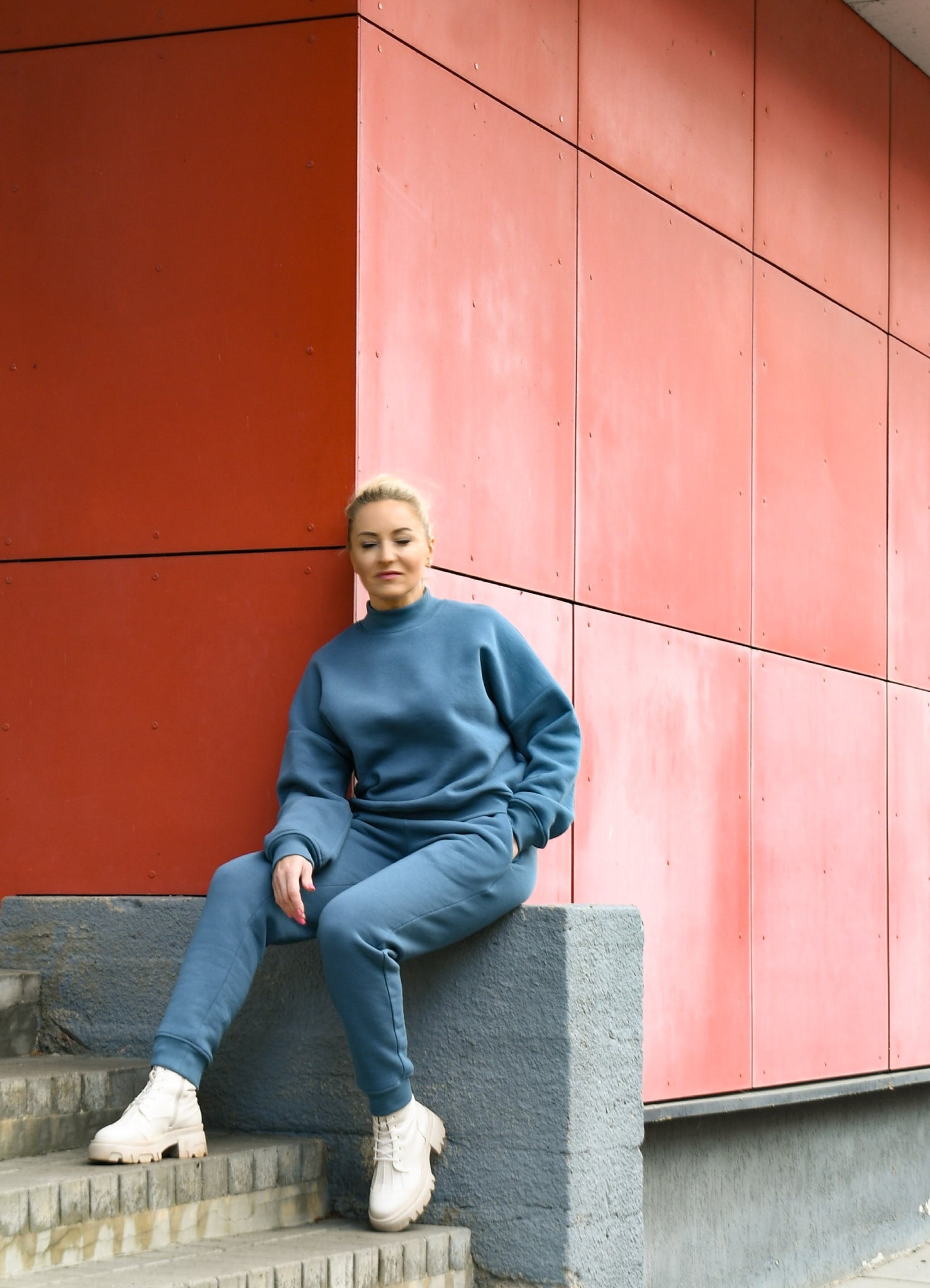 Švelni, nenuobodi, visiems tinkanti melsva spalva. Patogus, šiltas audinys su pūkeliu vidinėje pusėje. Kelnės su giliomis kišenėmis, juosmuo su guma ir medvilnės virvele.