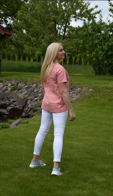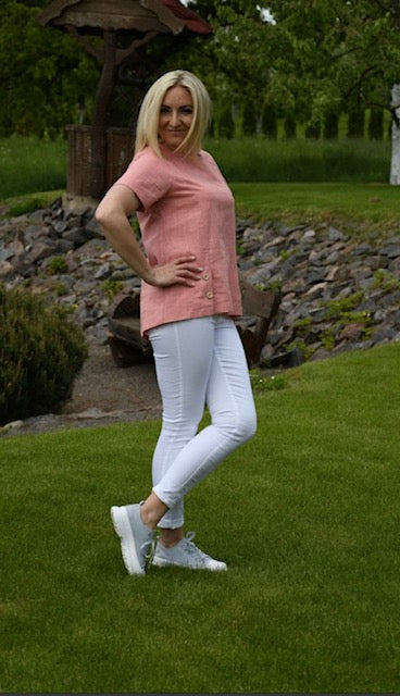 Rožinės spalvos lininio audinio palaidinė yra truputį platėjanti, su skeltukais, kurie susegti su sagutėmis. Nugarinė dalis prailginta.