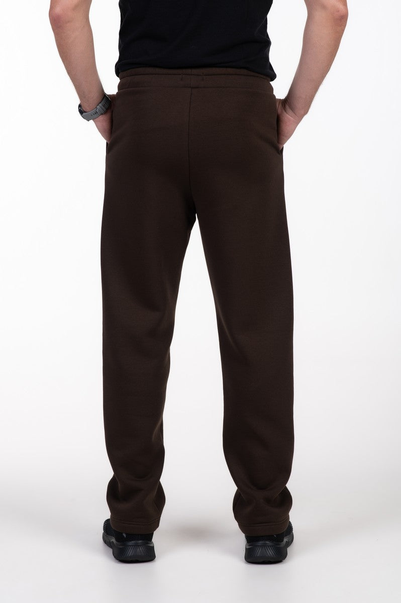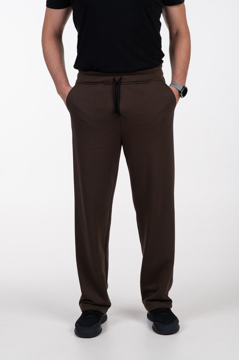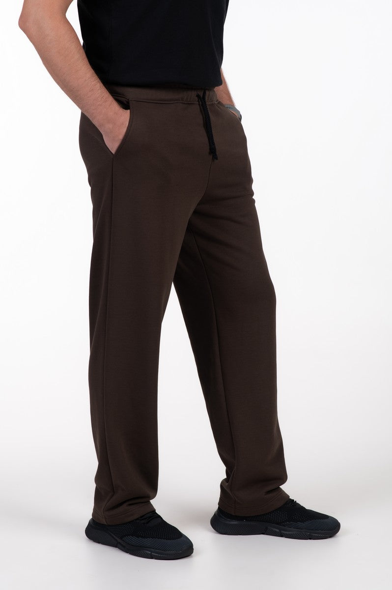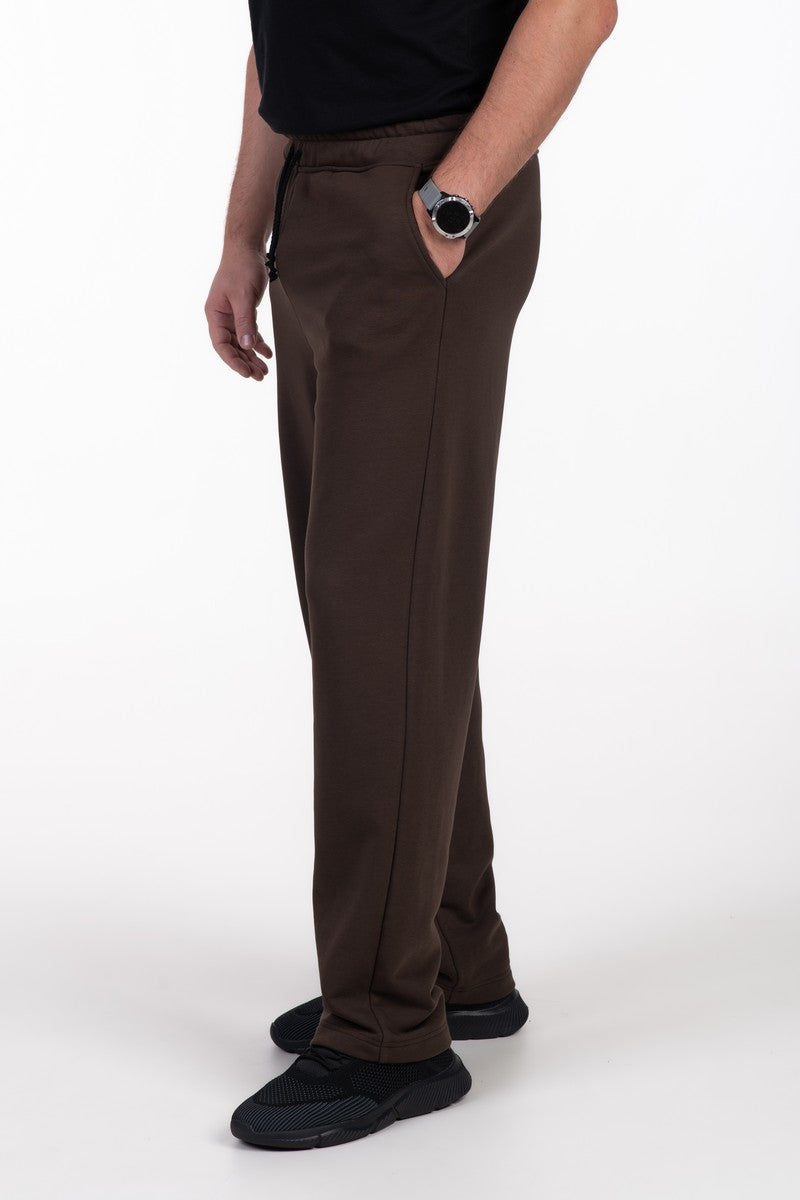 Kelnės rudos spalvos, tiesaus kirpimo, su kišenėmis. Juosmuo su guma ir raišteliu.
